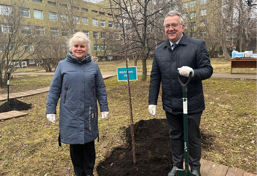 Представители УО «Гомельский государственный медицинский университет» заведующая кафедрой педиатрии, к.м.н. А.И. Зарянкина и доцент кафедры педиатрии, к.м.н. А.А. Козловский участвуют в посадке деревьев сада консорциума «5П Детская медицина»