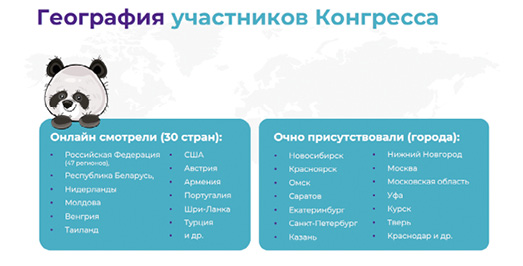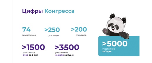 Программа конгресса включала 74 симпозиума, около 300 докладов, а также дискуссии, круглые столы. Несколько симпозиумов конгресса было организовано Международной академией педиатрии и детской хирургии с участием иностранных докладчиков. Спикерами мероприятия стали специалисты из 10 зарубежных стран: Турции, Италии, Индии, Китая, Таиланда, Беларуси, Казахстана, Кыргызстана, Узбекистана, Молдовы. В мероприятии приняли участие более 1500 человек очно и более 3500 — онлайн (рис. 5, 6).