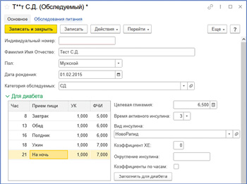 Для каждого пациента в системе регистрируются параметры расчета инсулина, в общем случае индивидуальные. Примерный вид карточки регистрации приведен на рисунке 2.