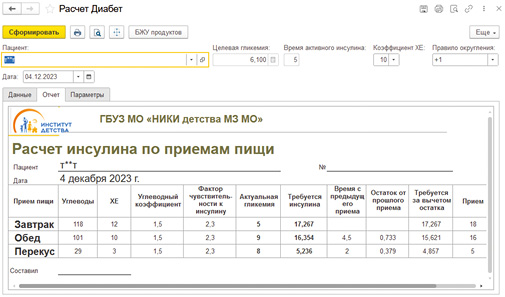 В рамках работы по теме НИР «Совершенствование программ диетологической помощи детям с алиментарно-зависимыми и генетически детерминированными заболеваниями» в Научно-исследовательском клиническом институте детства Министерства здравоохранения Московской области была разработана компьютерная система для оценки нутритивного статуса и физического развития. В состав системы был включен специализированный «калькулятор» для расчета доз быстрого инсулина.