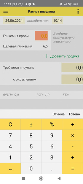 Пользователь вводит актуальную гликемию (рис. 5), для этого на смартфоне отображается экранная клавиатура. После ввода гликемии (кнопка «Готово» над клавиатурой) — следует добавить все блюда (продукты) предстоящего приема пищи.