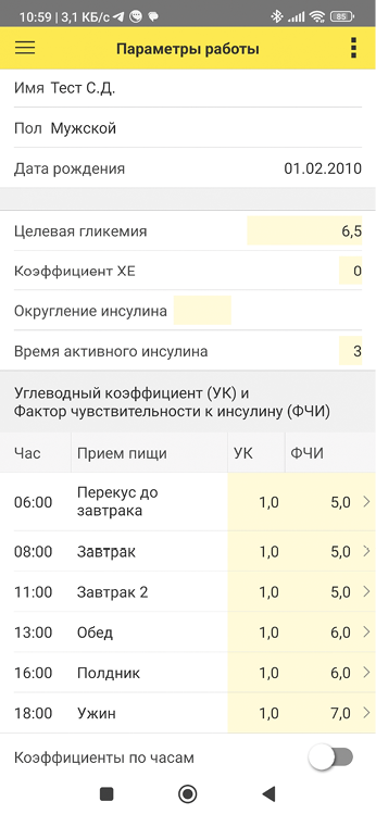 • ФЧИ — фактор чувствительности к инсулину — показывает, на сколько ммоль/л понизит глюкозу в крови 1единица ультракороткого инсулина. Значение, устанавливаемое врачом, вносится в параметры расчета с возможностью разных значений ФЧИ в зависимости от времени суток;