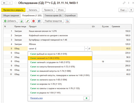 Как видно из рисунка 3, записи потребляемых блюд (продуктов) группируются по приемам пищи. Для каждой строки обязательно указывается масса порции в граммах. Блюда выбираются из встроенного в систему справочника (каталога) продуктов/блюд.